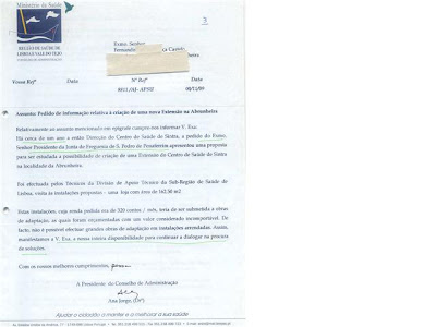 Há cerca de um ano a então Direcção do Centro de Saúde de Sintra, a pedido do Exmo. Sr. Presidente da Junta de Freguesia de S. Pedro de Penaferrim, apresentou uma proposta para ser estudada a possibilidade de criação de uma Extensão do Centro de Saúde de Sintra na localidade da Abrunheira.